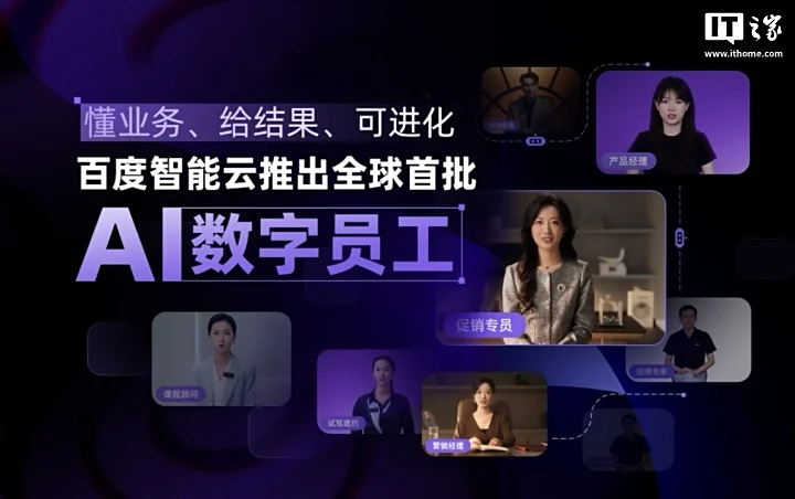 IT之家查询官方资料,本次发布的数字员工涵盖营销经理、还款助理、汽车销售、促销专员、产品经理、课程顾问、招聘专员等核心业务技能,依托百度智能云的 AI 全栈能力,号称“落地即上岗”,赋能垂直业务场景的同时持续沉淀岗位能力,具备“懂业务、给结果、可进化”三大能力。